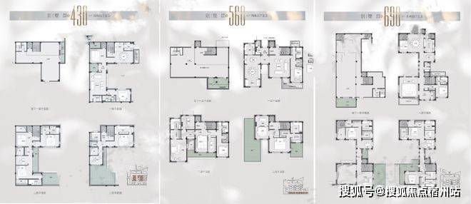 别墅是占主要大头的,且都是拼接型别墅:地上三层,地下一层,从430㎡-560㎡-690㎡三种,都是四房四厅五卫的设计。其主力总价段8000万左右