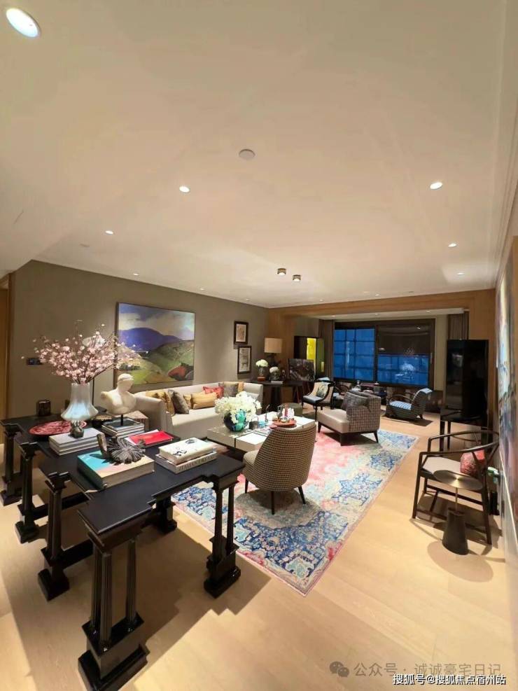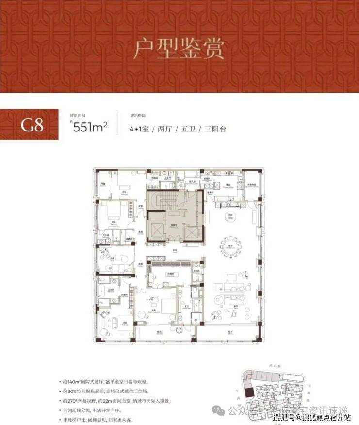 551㎡户型为四房格局,约140㎡客餐厅空间,南向面宽约22米,大面积景观面朝黄浦江与陆家嘴城市天际线