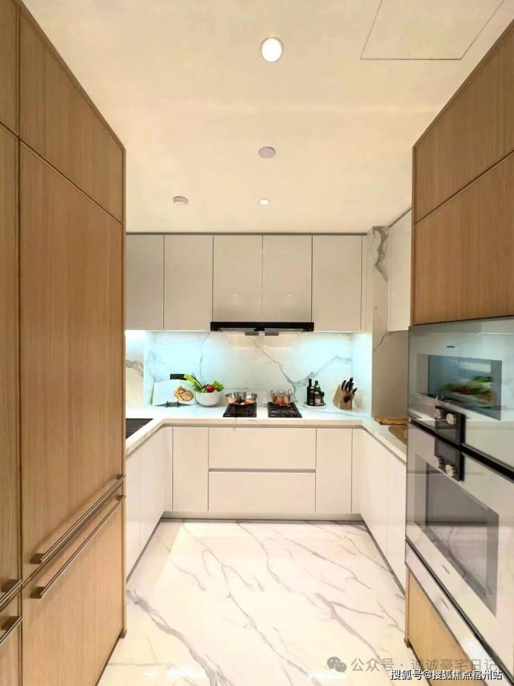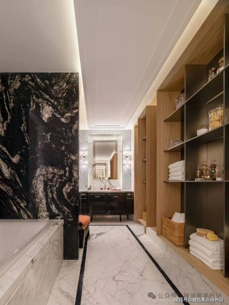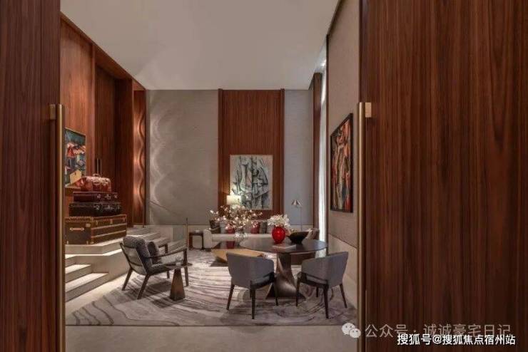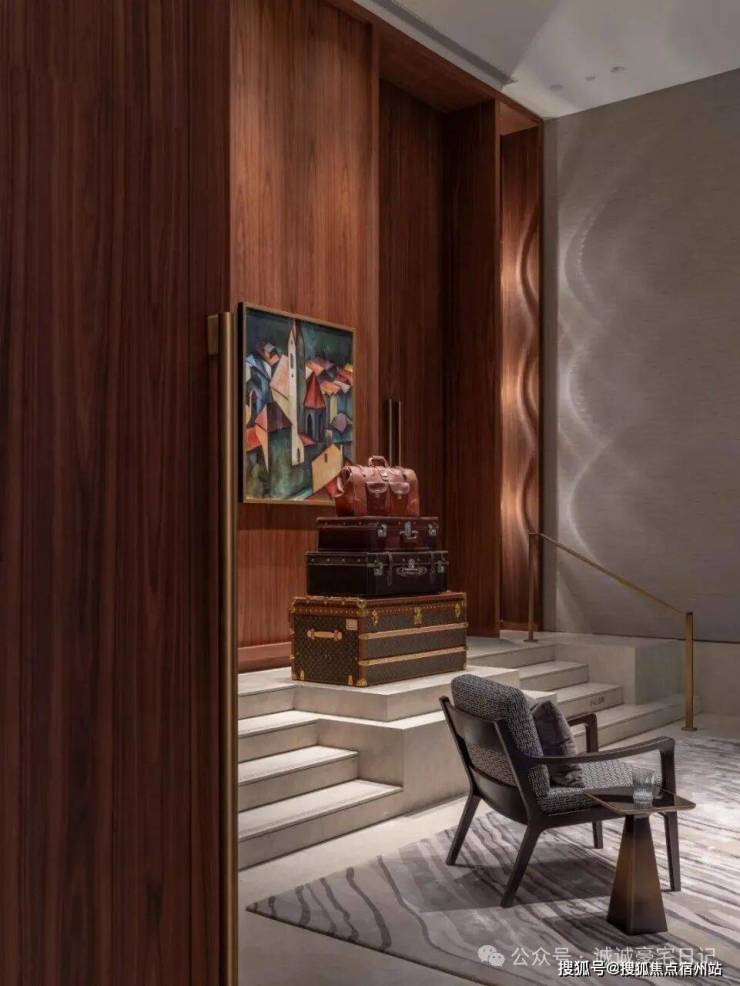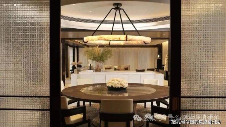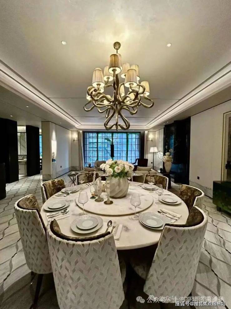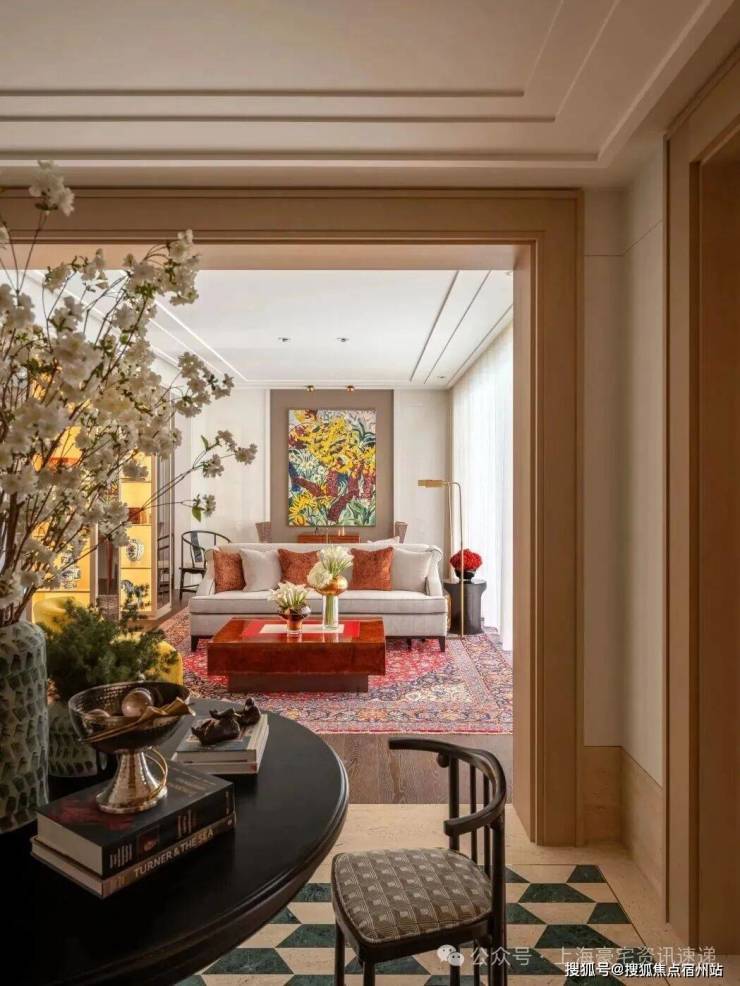 室内材料以洞石、胡桃木与烟熏橡木为主,并辅以金属细节,使整体空间既具有海派建筑气质,也保持现代住宅的简洁感