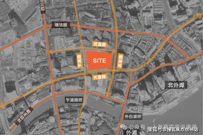 项目位于乍浦路天潼路,直线距离 上海外白渡桥仅200多米 ,是黄浦江和苏州河“源流汇聚”之处,与外滩豪景苑门对门。