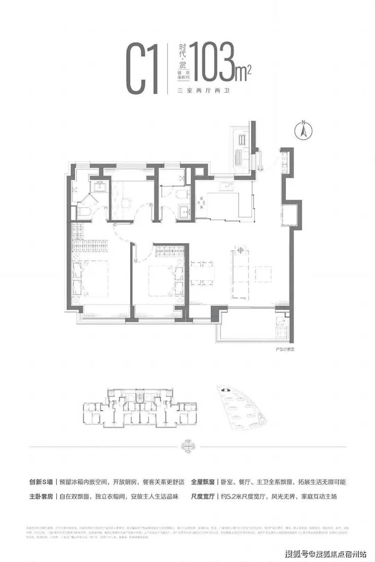 建面约89平的三房两厅一卫, 400万级别主打低总价,三开间朝南,通过S墙的设计解决了冰箱空间问题。