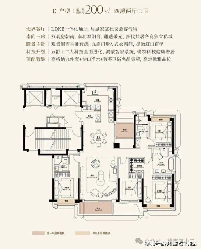以建面约200㎡的四房户型为例,格局方正通透,能很好地满足高端家庭的全生命周期居住需求。