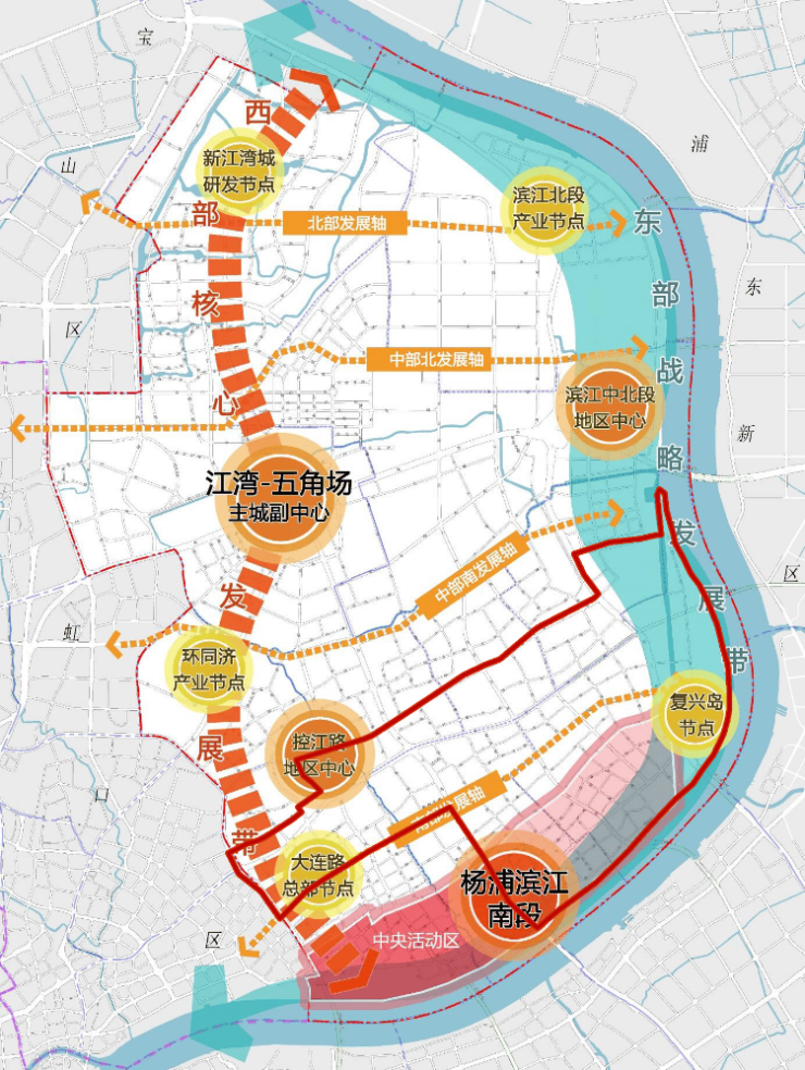 杨浦区2035规划为这片区域描绘了一幅宏伟的蓝图。为了加速实现“东西携手并进,南北互动发展”的战略目标,通过优化空间布局,促进功能区域的联动与融合,规划构建了一个以“一核引领,三心聚力,两带贯穿,四轴联动”为特色的总体空间架构。而周家嘴板块正位于南部发展轴的核心位置,与东部战略发展带紧密相连。