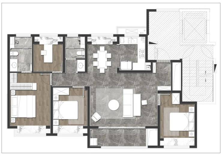 社区整体规划为南低北高,全部为1梯2户设计,无地上车位,全人车分流设计,北侧沿街布置商业,形成国际住区合理化布局,满足居民生活的便利性和品质感。
