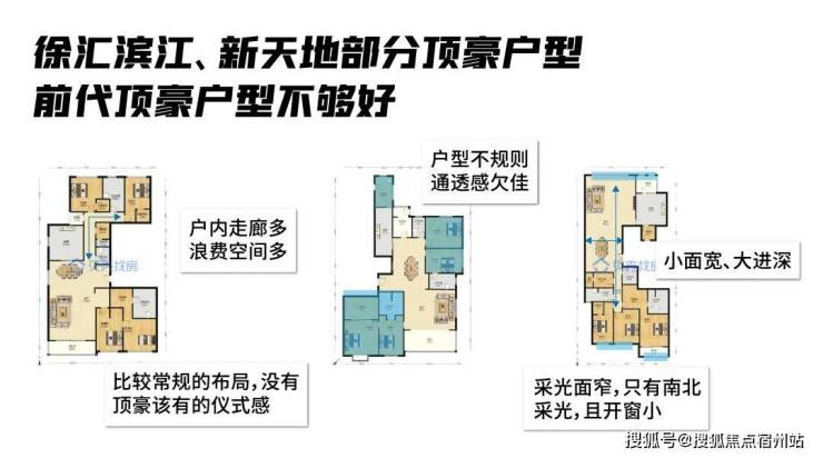 我也特意翻阅了徐滨、新天地部分顶豪户型图,发现诸多共性短板:户型普遍不规则、小面宽大进深的设计限制采光通风,多数仅依赖南北向采光,户内冗余走廊浪费空间,更缺乏顶豪应有的仪式感与尺度感。