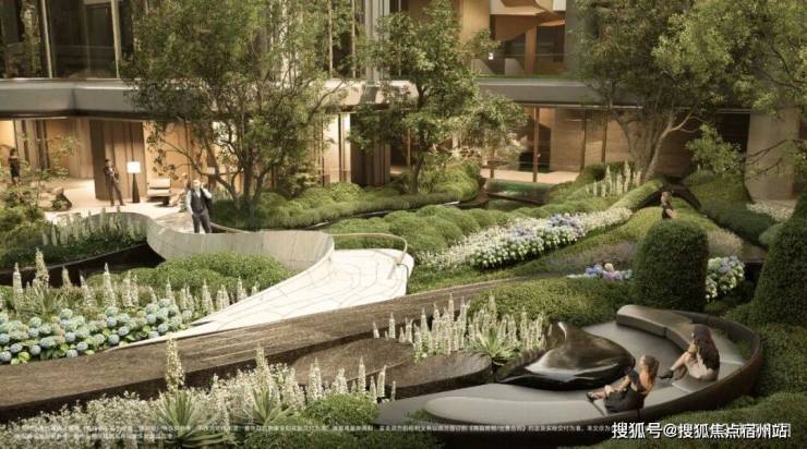 全域抬板带来约4米的垂直高差,项目在此基础上进一步下挖,打造出“沿街古树花园+板上浮空花园+板下流石花园”的多层立体景观体系。