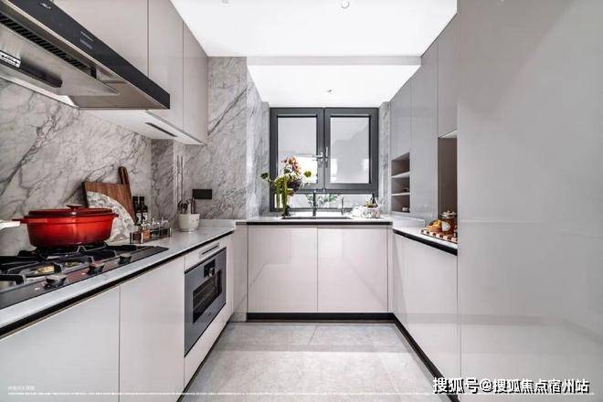 厨房搭载世界顶奢品牌嘉格纳的6件套,包括烟机、灶具、洗碗机、蒸烤箱及双嵌冰箱,搭配博洛尼橱柜+岩板台面、3M末端净水等超高品质的配置。