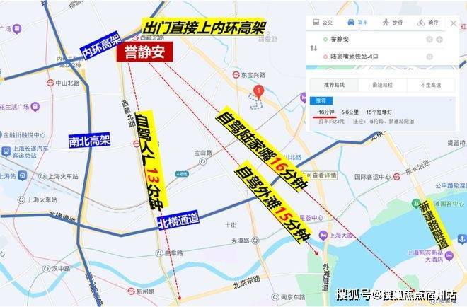 自驾也相当方便,项目出门即接入内环高架,直连南北高架、北横通道及延安路高架,可以便捷到达各个城市重要节点。从项目到陆家嘴、外滩和人民广场都在一刻钟左右(百度地图测量)。