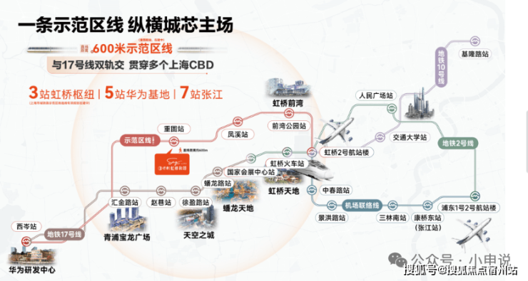 示范区沿线汇聚大量高能商业。2到到前湾芳乐路TOD,有开市客及前湾印象城(在建),3站到虹桥枢纽,则有虹桥天地及龙湖天街等。另外徐盈路天空之城、徐泾蟠龙天地、百老汇等也能快速抵达。