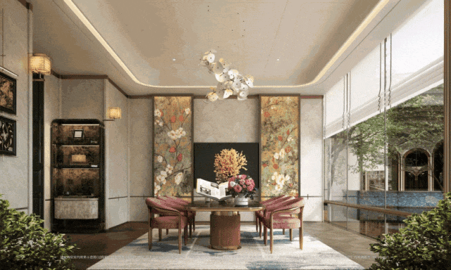 以玉兰门庭—迎归大堂—莳花荟为主轴,敬献步履生辉的归家艺旅:玉兰门庭如繁花盛绽,尊华瑞鳞水景聚运生财,双尊铜狮镇守家宅;迎归大堂流转光影艺韵,百羽栖澜艺术雕塑、芦海宸韵非遗绣作流淌摩登气韵;莳花荟中央会客厅移步异景,献映会客、休闲等雅会。