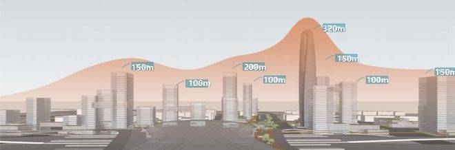 围绕地标塔楼和枢纽站房,采用较高强度开发,控制形成320-200-150-100-80米的阶梯建筑高度,塑造有较高识别度的城市天际线。