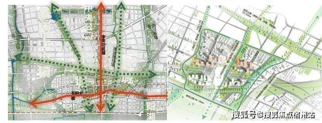 立足松江新城总体空间格局,沿南北向的中央功能轴,东西向的南部发展轴,蓝绿生态廊道,实现区域空间、功能大融合。