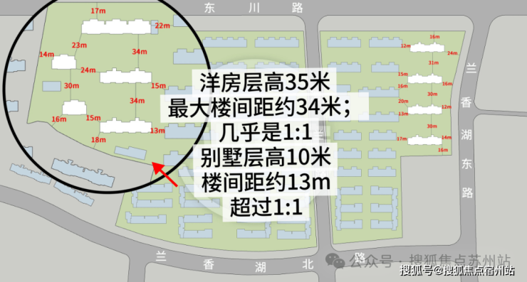 10米高的别墅,楼间距做到了13m左右!墅境洋房35米的层高,最大的楼间距做到了34m!