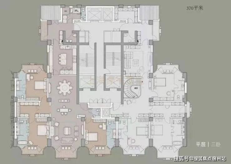主力面积为370、750、1500㎡三个面积段,即半层、一层、半层复式、整层复式几种,南侧一栋住宅户型呈金字塔造型,四间套房,超大客餐厅,充分利用南向面宽,360°采光不浪费一丝一毫江景。