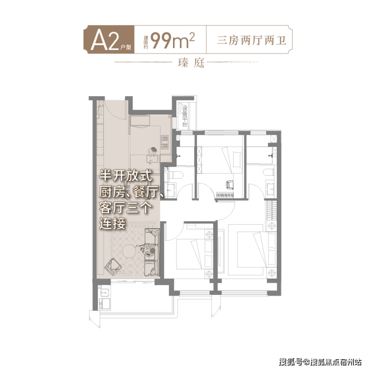 建面约99㎡全能3房: 约2.8米大尺度玄关柜+餐客厨空间+双面岛台收纳+高窗墙比采光面, 绝对是市面上的“明星户型”!