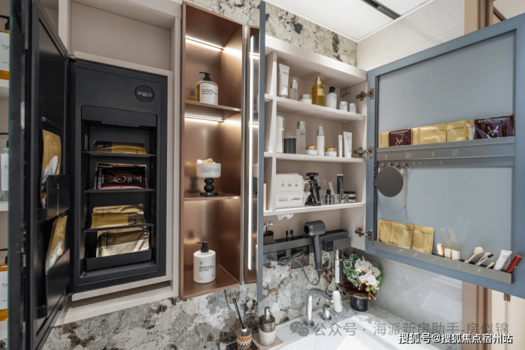 看不见的巧思——立体收纳系统 :项目层高达到 3.1-3.3米 ,借此优势创新打造了 “竖向收纳”体系 ,通过顶部储物柜、机舱式高柜等设计,将垂直空间利用到极致,小户型也能拥有大宅的储物容量。