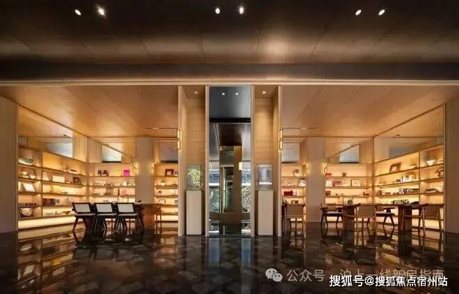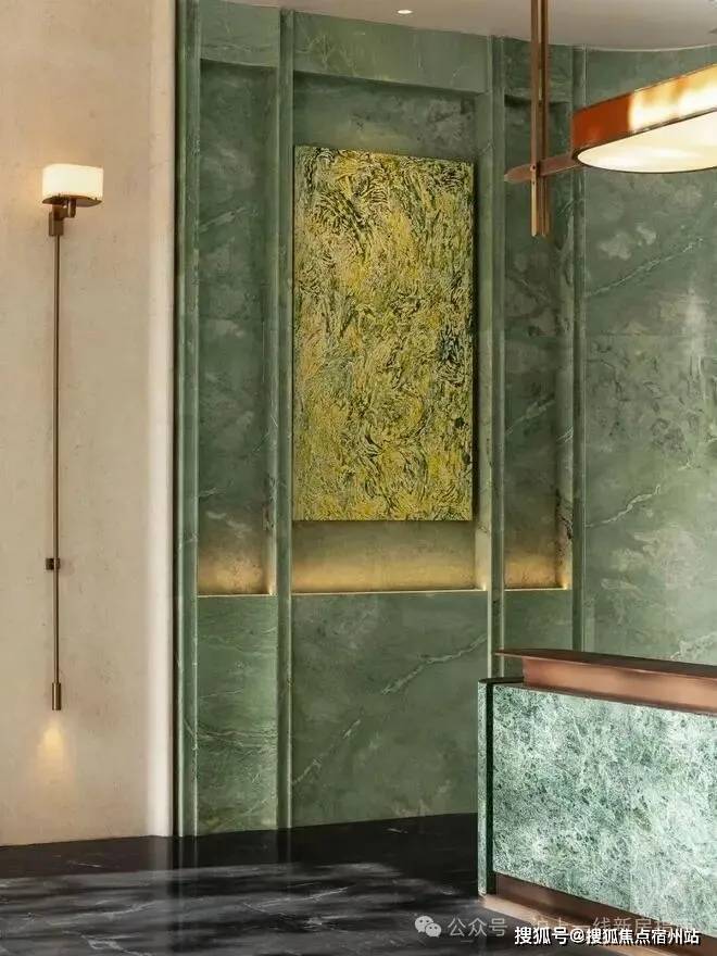 项目公区大量采用各种昂贵石材,以高端酒店的标准定制与打造。比如主入口大堂,是带有青绿色纹理,名为只此青绿的奢石,地面用的是太古黑金奢石,高奢的调性一下子显现出来。