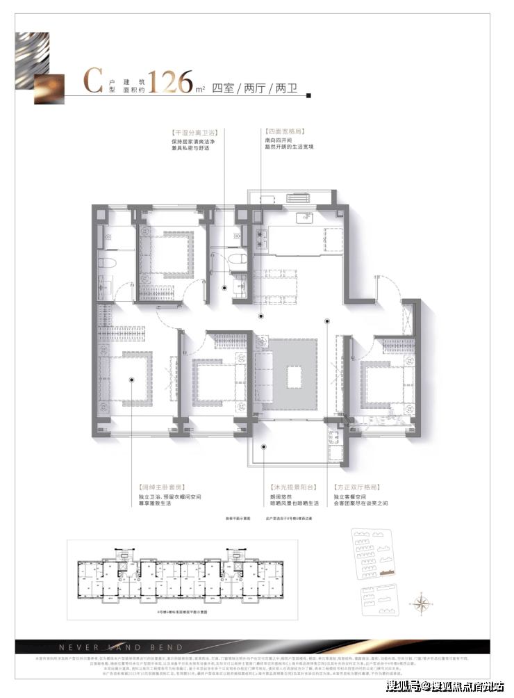 建面约126㎡真四房,进一步强化功能性,户型方正,四开间朝南,南北通透,南向卧室均带有大飘窗设计,拓宽了室内景观视野的同时,增加了实际空间使用率,有效避免面积浪费。