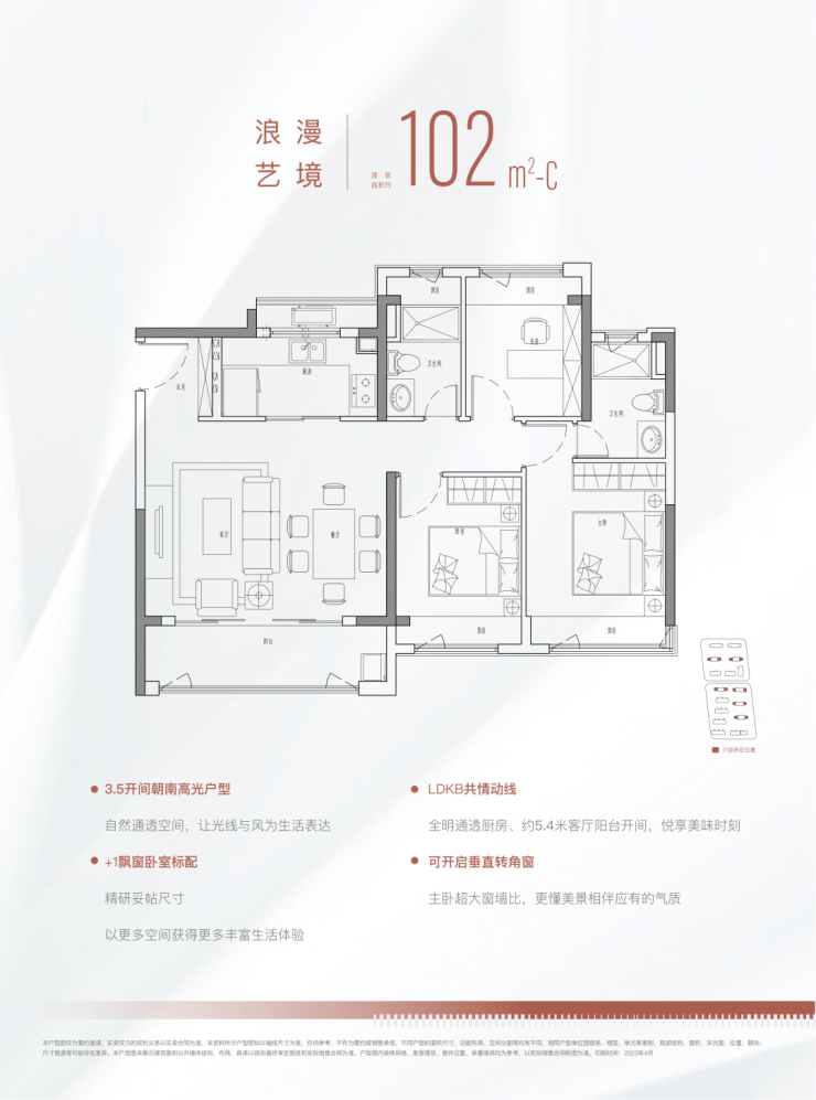 在大部分百平三房还只有约3.5米长的阳台时,这个项目把阳台拉长到了约5.5米,在视野上更开阔。