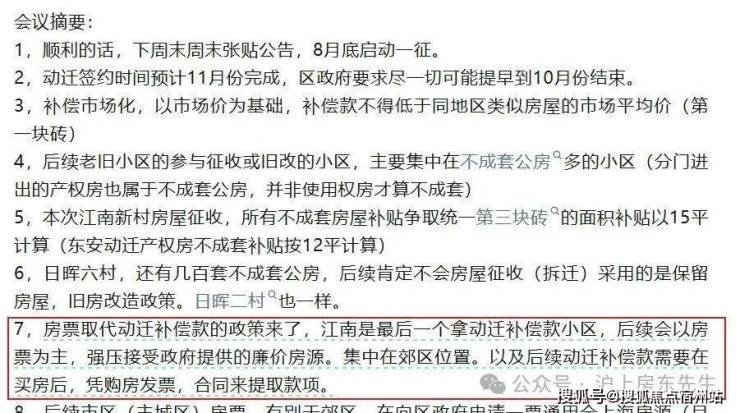 8月份市场流传出一份徐汇江南新村的动迁会议纪要,其中提到了“江南新村将是最后一个拿动迁补偿款的小区,后续以房票为主。”