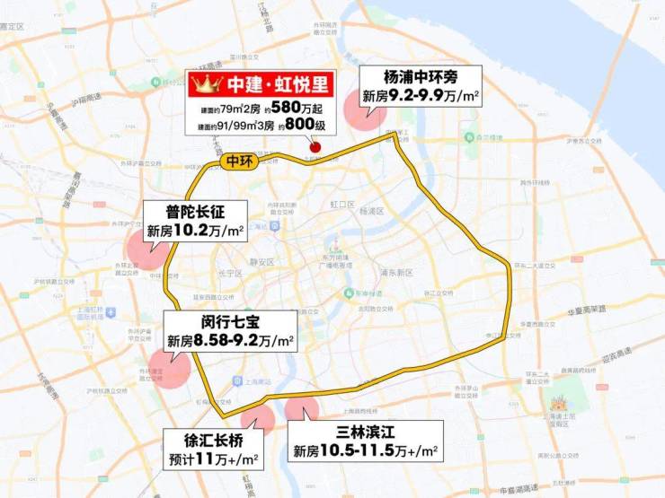 同环线普陀长征新房均价 10.2万/㎡;闵行七宝也已 8.58-9.2万/㎡。