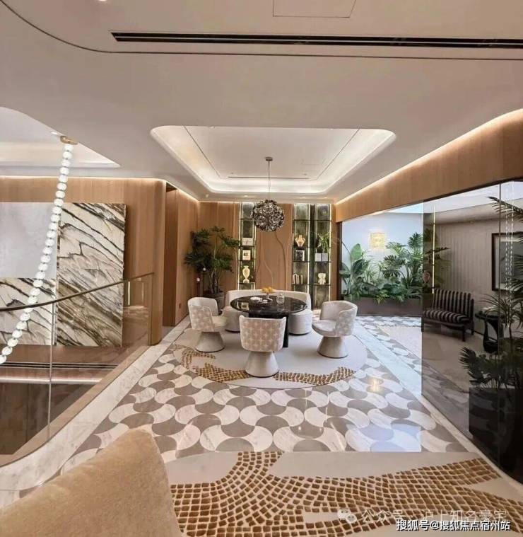 比如,半标无边界泳池以渐变马赛克墙面、水波纹感天花与透景玻璃幕墙,将下沉庭院景致融入其中,这处可游憩的水下艺境,就是一座美术馆级的美学场域。