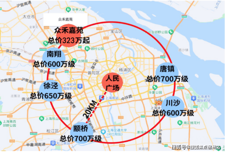 从人民广场为中心,直线距离约20公里,所覆盖的环线区域有南翔、徐泾、唐镇、川沙等板块的新房价格约600-700万之间。而从地图直线距离来看, 众禾嘉苑不仅距离市中心更近,且总价仅323万起,其价格洼地的优势已显而易见!