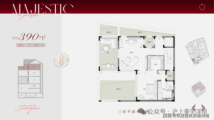 合院地上三层,面积段约210-500㎡,计合院82套。