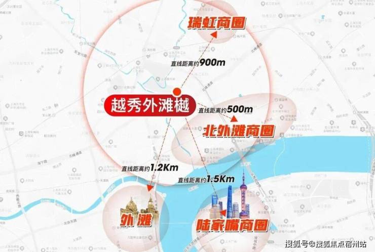 越秀外滩樾直线距离外滩源仅约1.2公里,直线距离北外滩商圈约500米,直线距离瑞虹商圈约900米,直线距离陆家嘴商圈约1500米!