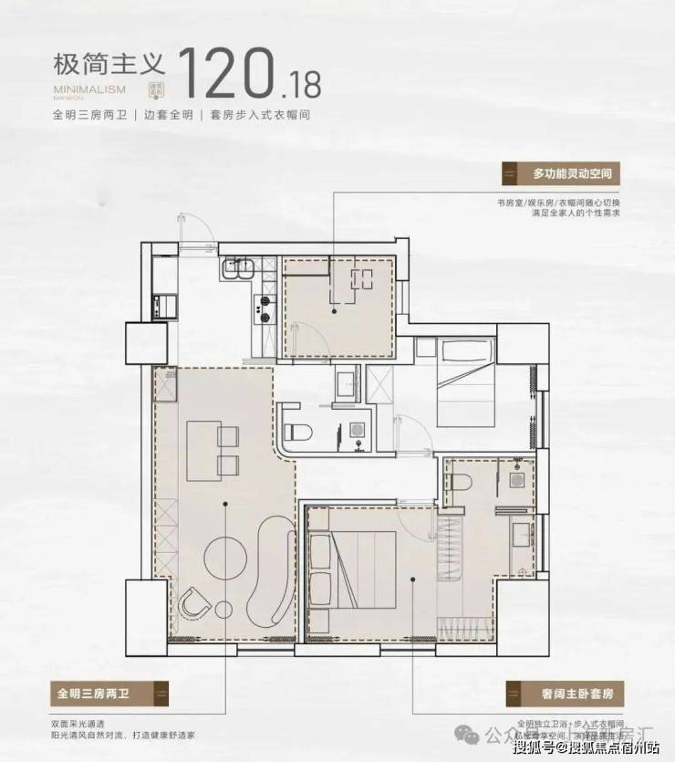 户型设计上,打破公寓常规暗间的局限,项目全部设计成全明2房或3房格局,做到没有一个暗间的居住空间,并全系标配主卧套房+双卫配置,提升居住配置。