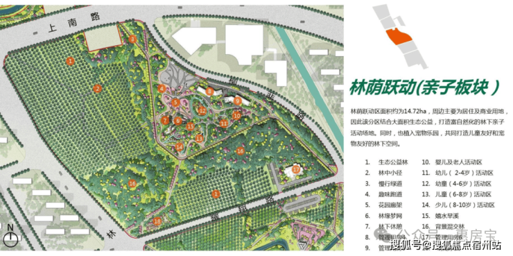 整座公园 (在建中 ) 划分为:湿地花园区、鸣湖共享区、林荫跃动区和社邻园艺区,四大功能分区。
