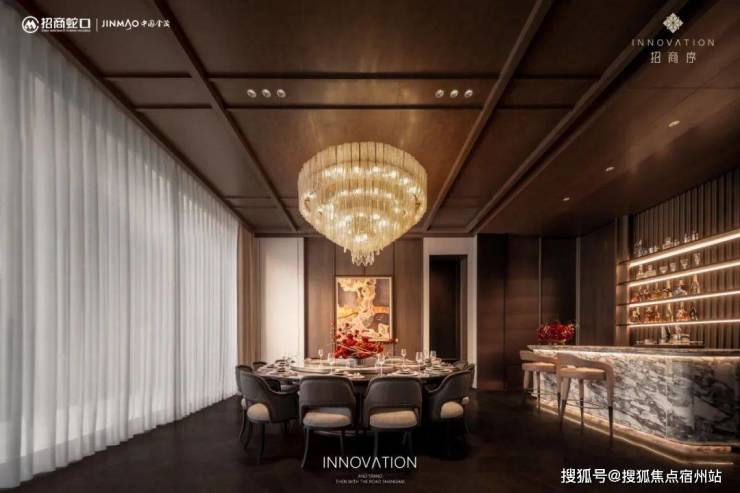 而业主专享的私宴厅则是将 “尊贵感”说到了极致! 臻选奢石营造雅致屏风,墙上大师匠呈繁花艺作,定制灯具璀璨生辉,摩登意蕴充盈其中,匹配大人物品位。除了敞阔的就餐空间,还独立配置吧台、品茗休息区。暮色四合,华灯初上,谈笑风生中展现风雅从容,觥筹交错间皆是繁华丰茂。