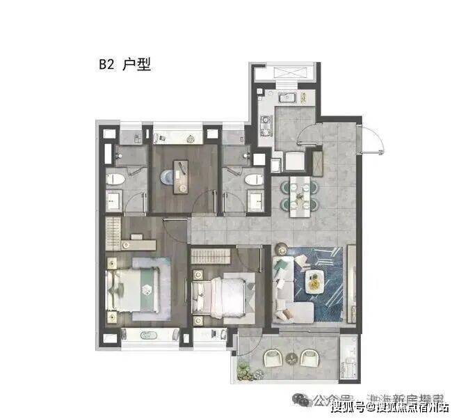 建面约105㎡为5.1米宽厅设计外接大阳台,这对黄金组合一方面撑开户内尺度,另一方面也让通风和采光俱佳。
