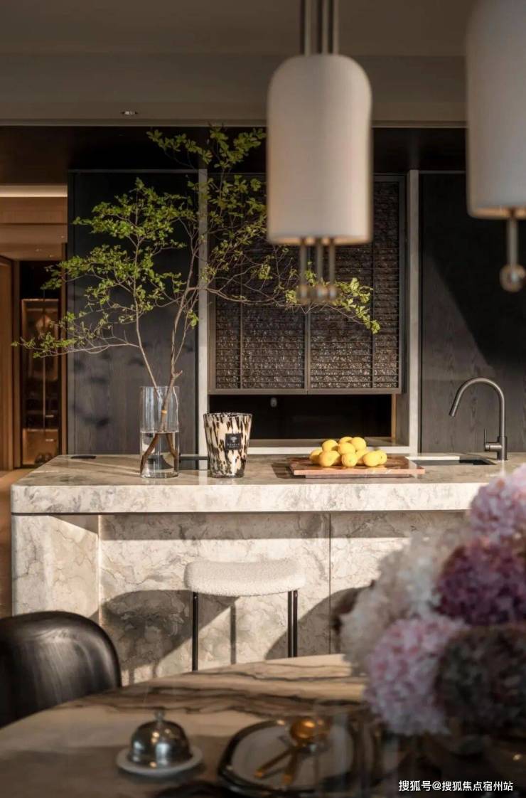 ✔高定选材 :玄关地面选用 “白雪公主”玉石 ,质感温润高级;地面延展 祥云灰水墨岩 ,与外滩华尔道夫酒店同源材质,瞬间提升空间格调!