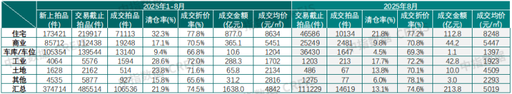 5、全国法拍房情况。根据中指研究院数据,今年1-8 月全国355城法拍市场各类法拍房源挂拍数量累计48.5万套,成交10.7万套,总成交金额1638亿元,按拍品清仓率21.9%挂拍48.5 万套,成交 10.7 万套(清仓率 21.9%,去年为21.6%),金额 1638 亿元;住宅成交 7.1 万套(877 亿元,占比 53.5%),二拍成交占比 48.4%。而2023年355城法拍市场各类法拍房源挂拍数量累计79.6万套,成交14.9万套,总成交金额3004.1亿元。