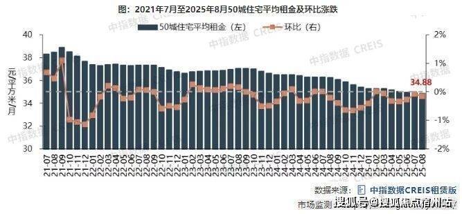 6、全国大中城市租金情况。根据中指研究院数据,全国50城住宅平均租金环比跌幅略有扩大,今年8月50个城市住宅平均租金为34.88元/平方米/月,环比下跌0.15%,同比下跌3.76%;而2021年7月50个城市住宅平均租金超过了38元/平方米/月,到了2022年6月50个城市住宅平均租金为37.3元/平方米/月。