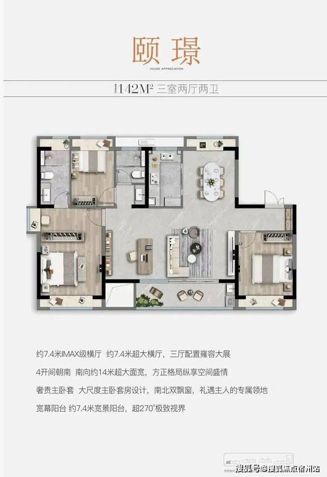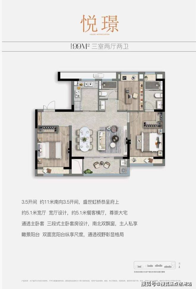 户型点评:百平左右的户型打造三室很常见,但能同时做到南向3.5开间属实难得;餐客横厅更是达到了约5.1米的宽度设计,大幅提升了生活舒适度、以及实用性;主卧套房,涵盖步入式衣帽间与独立卫浴,✅✅中建颐璟台售楼处电话:400 - 8824 - 258✅✅南向自带飘窗,缔造尊贵私密私享。