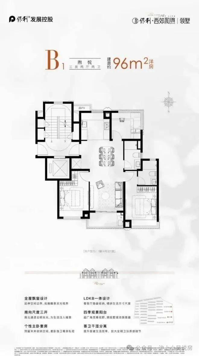 建面约96㎡的 洋房户型,以三房两卫的全能格局。LDKB 一体化设计,打破空间边界,让餐客厅与阳台流畅相连,成为家庭互动、宴请宾客的活力场域 。全屋飘窗延展空间,引阳光与风景入室,三开间朝南、南北通透。北向多功能间,附带270°广角视界,让每一寸生活都浸润在风景里。主卧套房预留收纳空间,给予主人私密尊崇。从起居到观景,从社交到休憩,全方位适配品质生活需求,是洋房里的理想栖居范本 。