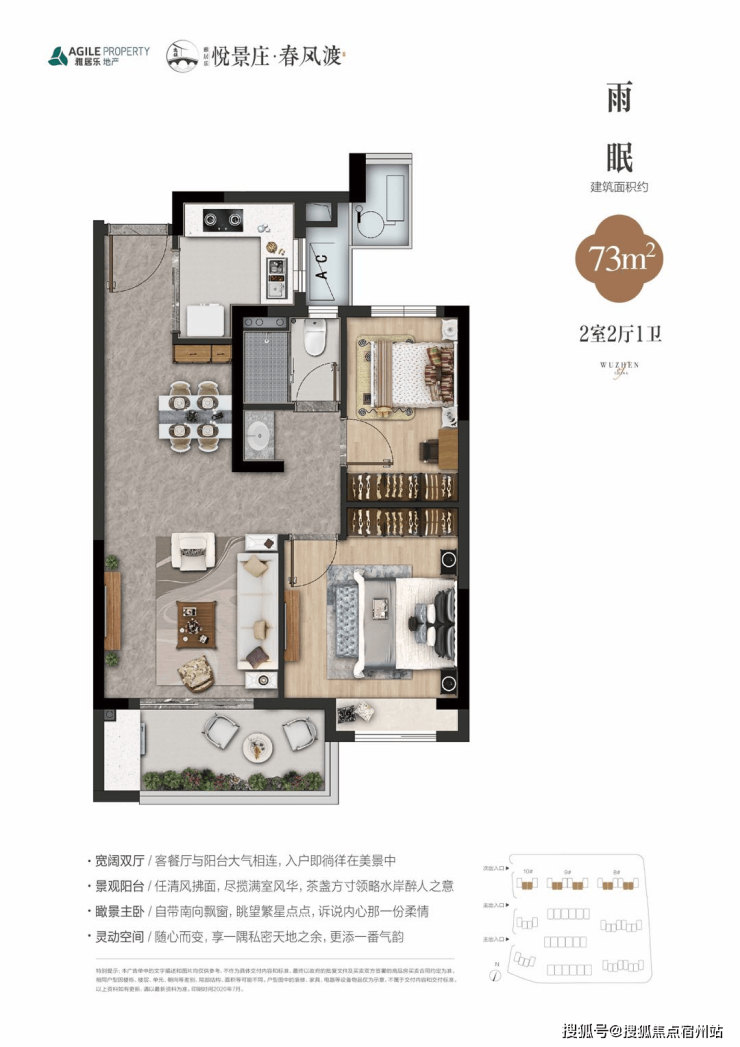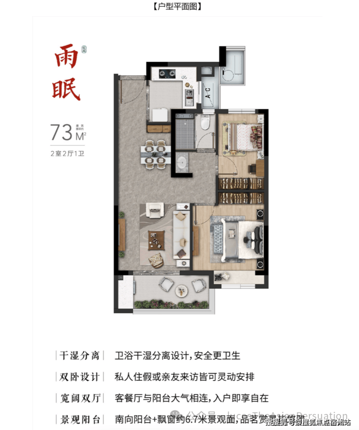 73㎡两室户型是全盘起步档,更是板块内唯一供应,入户玄关设计为小户型规划更多收纳空间,客餐厅一体连接南向景观阳台,进门即可观赏江南美景,主卧带南向飘窗,清风流转、视野开阔,卫生间做了干湿分离+防滑地面+扶手设计,兼顾实用性与康养需求[4]。