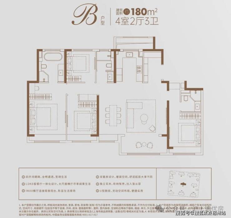 五开间朝南的全明通透,四房两厅三卫,双主卧设计,舒适起居大享不同,使得其居住感相当阔绰,为生活增添更多情景体验。在精巧铺排上,LDKB客餐厅一体化设计,大尺度横厅尽享阔景生活;动线合理的基础之上,户型格局方正,赋予生活幸福美感。
