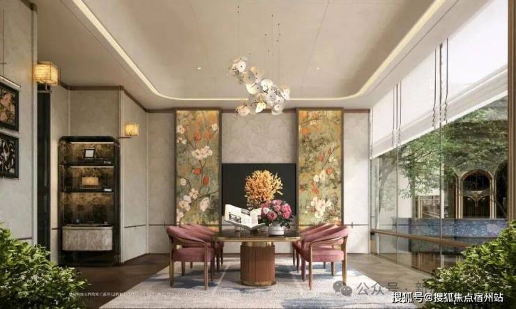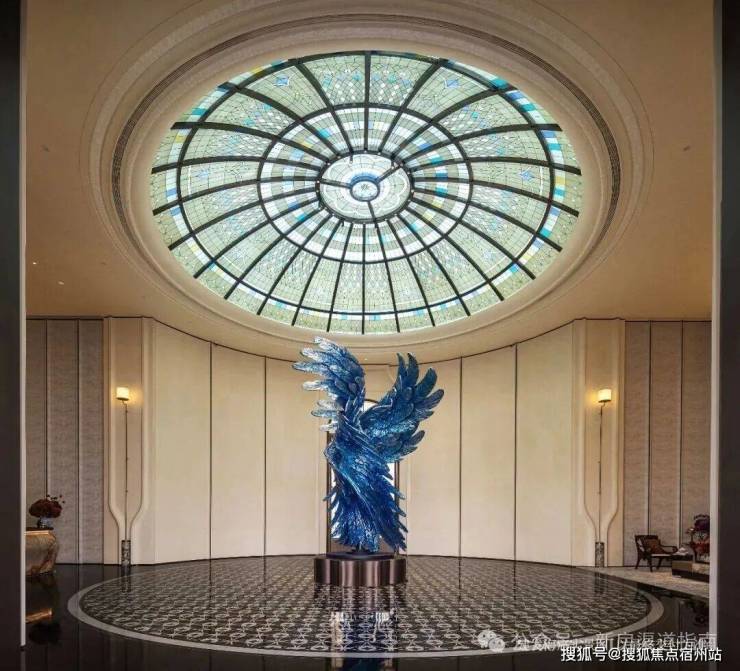 以玉兰门庭—迎归大堂—莳花荟为主轴,敬献步履生辉的归家艺旅:玉兰门庭如繁花盛绽,尊华瑞鳞水景聚运生财,双尊铜狮镇守家宅;迎归大堂流转光影艺韵,百羽栖澜艺术雕塑、芦海宸韵非遗绣作流淌摩登气韵;莳花荟中央会客厅移步异景,献映会客、休闲等雅会。