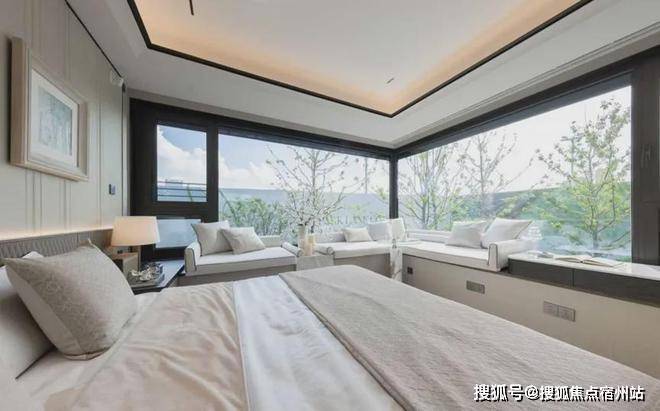 2#号楼的边套主卧户型配置270°环幕飘窗,不仅延伸空间尺度,更将水岸、园景“框”成私藏壁画。晨间,阳光透过飘窗铺满床榻;深夜,枕着河风与月光入眠,这是专属建面约165㎡的“观景特权”,让每一寸空间都流淌着自然诗意。
