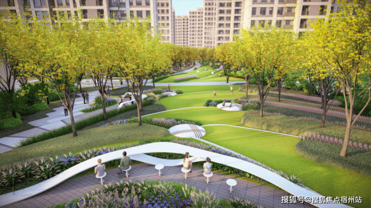 公园+花园的双园社区、品质归家入口、特色阳光草坪、双会客系统、主题儿童乐园、健身系统六大功能价值叠加由三条不同主题的林荫步道和三个圆形景观节点组成的全区漫步系统,共同构建“6+1”森O₂家园。