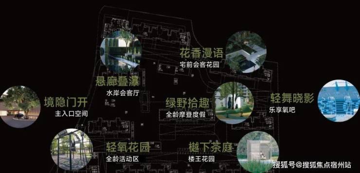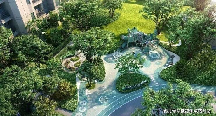 还能在归家的动线上体会到不同的景观节点:境隐门开(主入口空间)、悬廊叠瀑(水岸会客厅)、绿野拾趣(儿童乐园)、轻舞晓影(乐享氧吧)、樾下茶庭(宅前花园)、花香漫语(宅前会客花园)、轻氧花园(全龄活动区)。