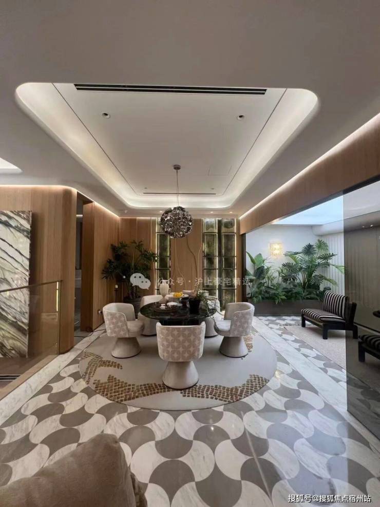 当然,室内更超乎想象。除了在选材上择取了高贵高质的石材、皮革影木等高档材质外,制作工艺才是真正的品质表现。从无限连纹地砖铺设到花瓣拼式的地板效果,以及香格里拉翡翠水刀拼花的背景墙面,整个空间展示的不仅仅是品质,更是审美,接近于艺术的审美表达。