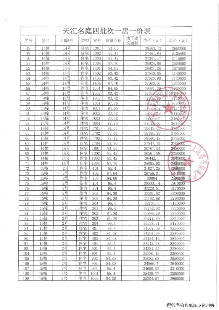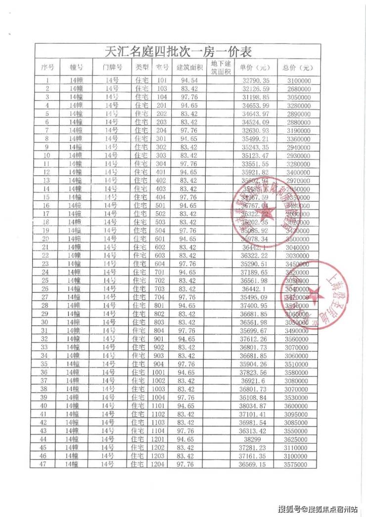 象屿江湾悦府一房一价表: