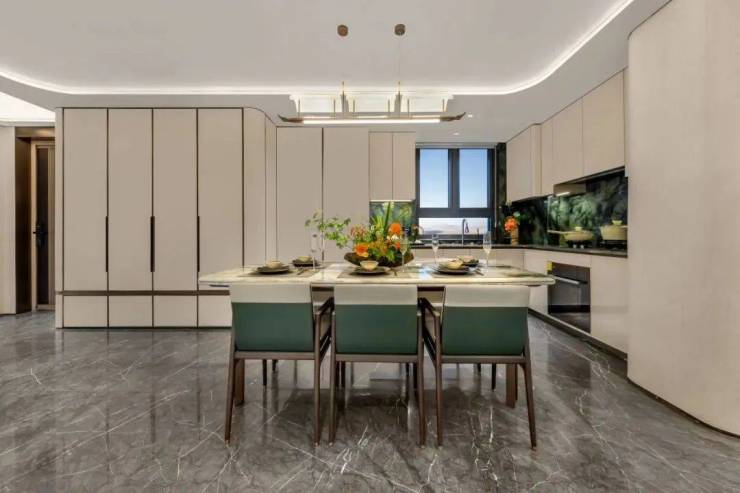 客餐厅+厨房+阳台一线相连,是一个非常标准的南北通透户型,室内的采光以及通风都非常出色。