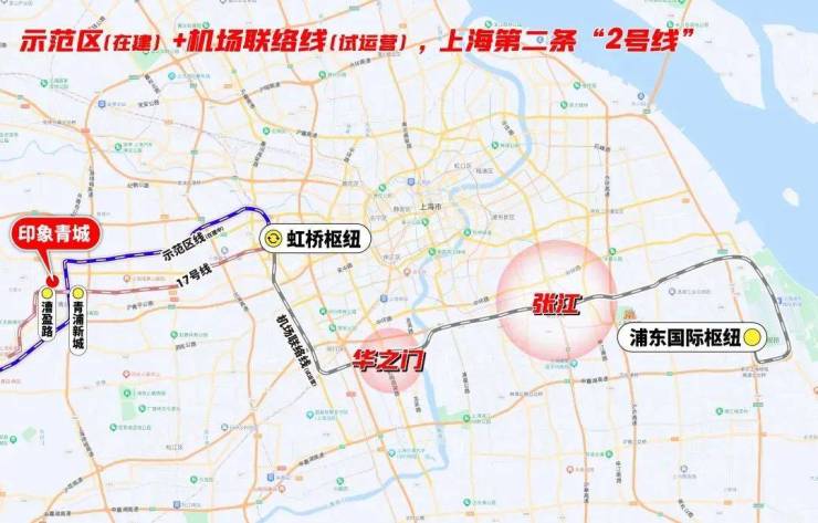 但这还不是全部,17号线+示范区线(在建)左手长三角一体化、华为,右手前湾、大虹桥总部商办,并通过虹桥枢纽,串联2号线及正在试运营的机场联络线,把市中心、徐汇、闵行、张江等高能板块都纳入印象青城的通勤版图。
