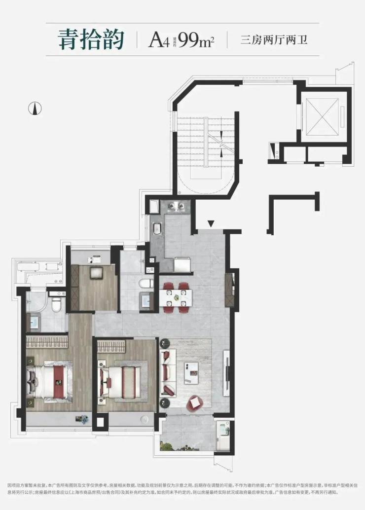 建面约99㎡爆款户型!约99㎡3房2卫户型是上海市场中最主流的面积段之一,但印象青城的户型设计却超脱以往。