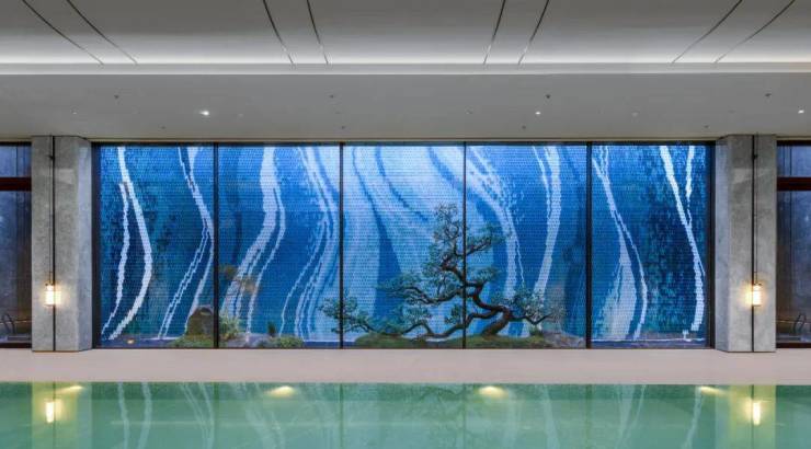 第六景-扁舟唱晚:设计为一面美轮美奂的曲面瀑布,天青色墙面诉说着传承百年的历史底蕴。